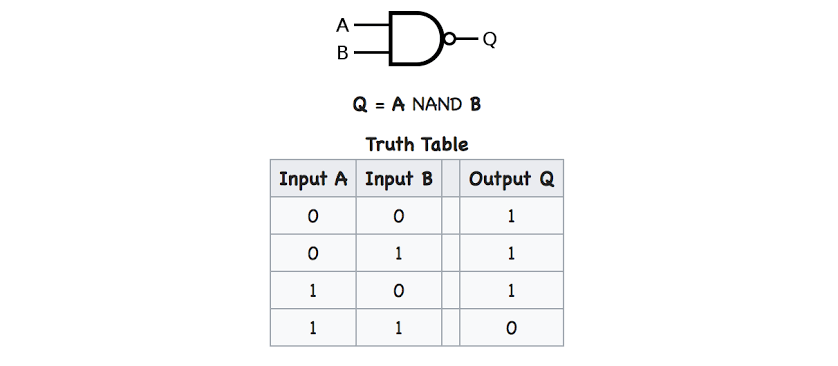 NAND gate is nothing but an AND gate with NOT gate connected to the output, that’s mean that the output is zero(Low) only when all the inputs are one, and one any other case.